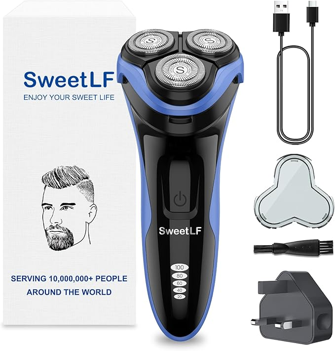 SweetLF Electric Razor for Men, 120 Min Shaving, Fast UK Adapter (1H Charging),100% Waterproof, Wet & Dry Rotary Shavers for Men with Pop-up Trimmer, LED Display, Blue Black